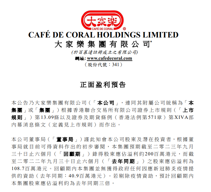 预告显示,集团截至2023年9月30日止六个月(回顾期)录得股东应占溢利约 200百万港元。若剔除疫情资助,预计回顾期内集团股东应占溢利约为去年同期的三倍。