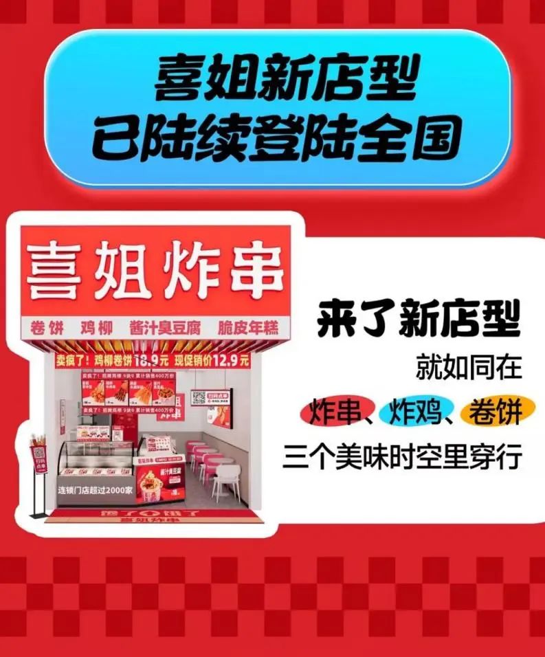 最后,我们来看个数据,喜姐炸串今年推出新店型,增加炸鸡、卷饼等超级性价比的主食类产品,满足顾客不同维度的需求,消灭掉一天中的门店“淡季”。