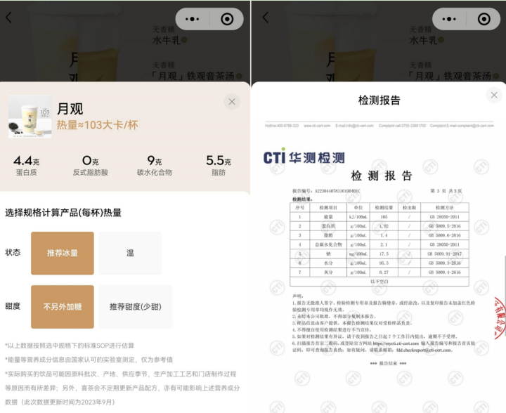 (图:喜茶公开的月观产品营养成分和权威检测报告)
