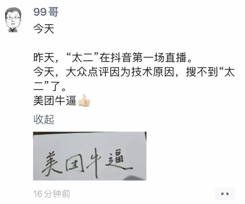 在此前一天,九毛九集团创始人管毅宏在其个人朋友圈暗示称,这一屏蔽与“太二”前一日的抖音第一场直播有关。