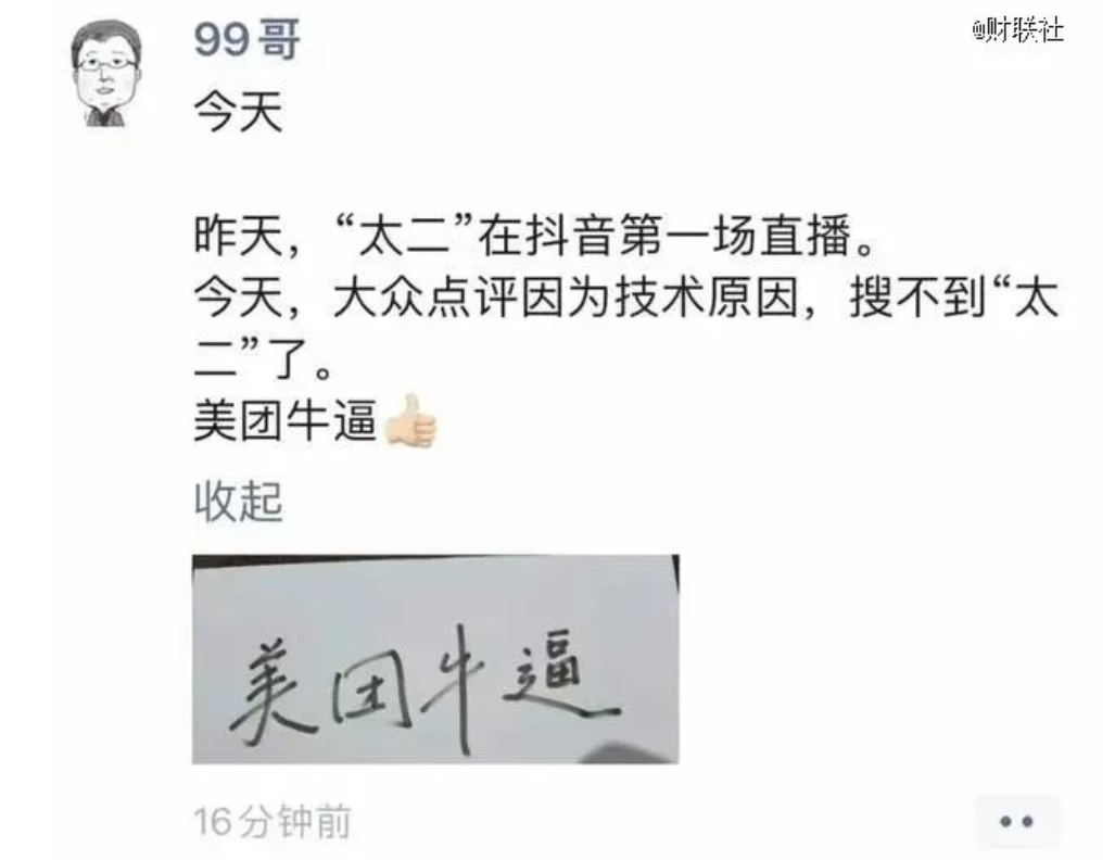 太二酸菜鱼公关虽然没有透露多少美团相关信息,但九毛九集团董事长管毅宏直接发布朋友圈,“昨天,‘太二’在抖音第一场直播。今天,太二点评因为技术原因,搜不到‘太二’了。”