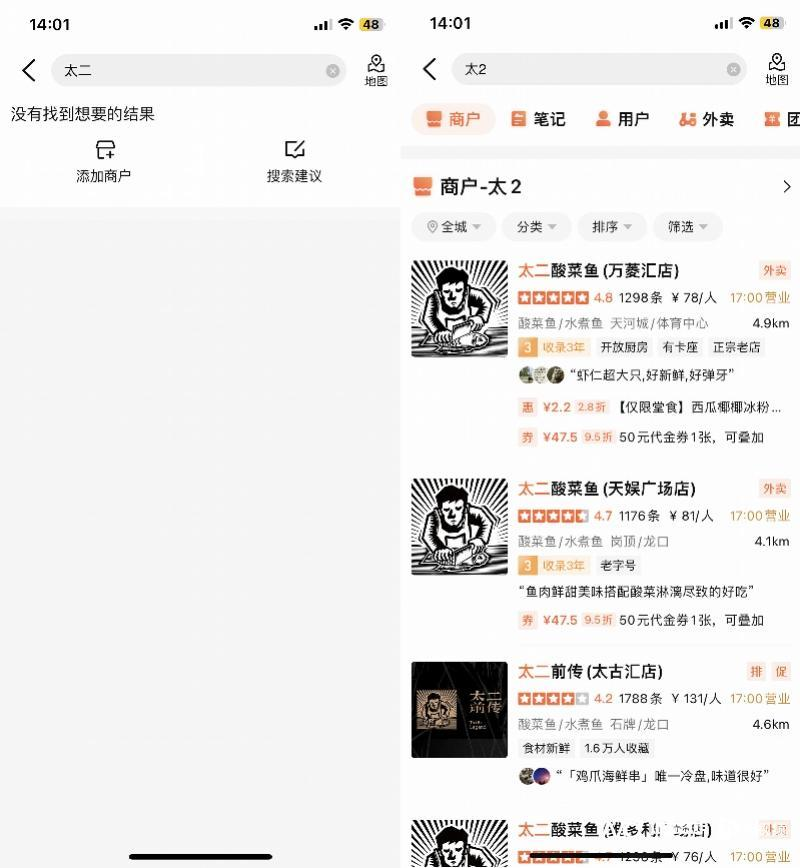 将检索词换成“太2”就能正常显示,美团平台太二酸菜鱼门店皆正常。