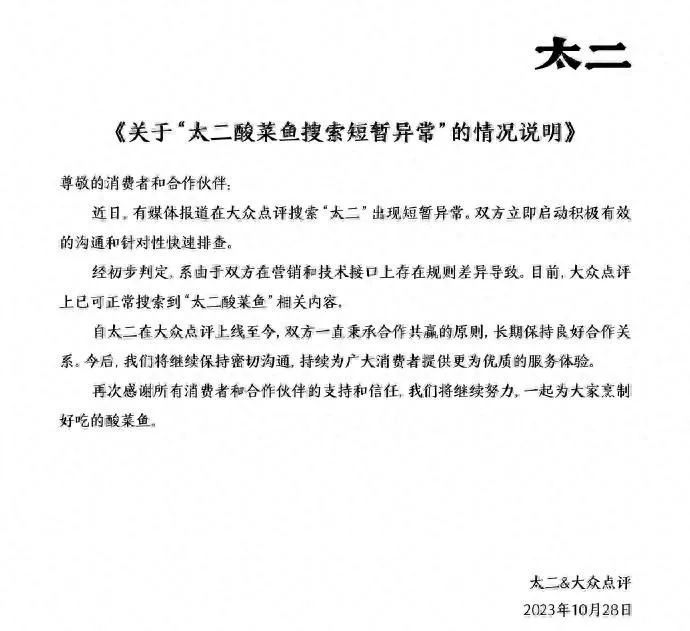 10月28日下午,太二酸菜鱼在其微博官方账号中发布《关于“太二酸菜鱼搜索短暂异常”的情况说明》称,近日,有媒体报道在大众点评搜索“太二”出现短暂异常。双方立即启动积极有效沟通和针对性快速排查。经初步判定,系由于双方在营销和技术接口上存在规则差异导致。