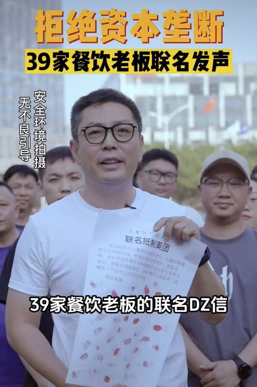 魏家凉皮事件之后不久,知名餐饮人李剑更是联合了多位餐饮人在离美团总部不远处,手持39位餐饮老板的联名抵制信,发视频控诉美团十宗罪,佣金刺客、逼迫商家做平台活动、压榨骑手....号称拼上亿万身家也要与美团斗到底。