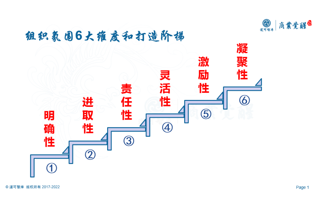 通常一个好的组织氛围的形成必定要跨过这六大层级,即明确性、进取性、责任性、灵活性、激励性、凝聚性。