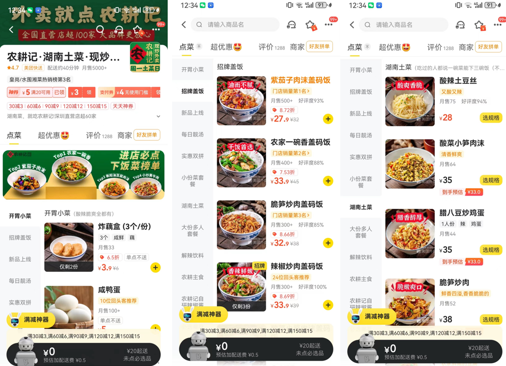 相比堂食而言,农耕记外卖店在产品上显然做了简化,去掉了高价值菜品,蒸品等更不适合外卖场景的产品,主推更适合一人食的经典且出餐快的湖南土菜小份菜,以及现炒盖码饭,既有对主品牌“土味湘菜基因”的继承,同时在品类上也做了创新。
