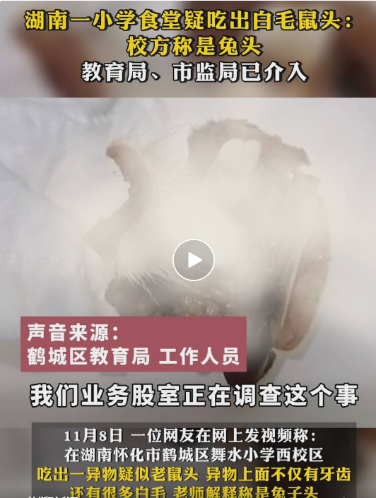 11月8日,有网友发视频称,湖南怀化鹤城区舞水小学西校区,食堂吃出疑似老鼠头的异物,老师解释称是兔子头。