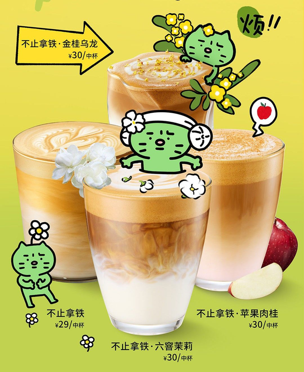 11月8日,Tims咖啡联名焦绿猫推出趣味新品,含”不止拿铁“系列的经典拿铁,金桂乌龙,六窖茉莉,苹果肉桂四款饮品,价格在29元到20元不等,还包括蓝莓芝士馅微笑贝果。11月8日-16日期间,购买“不止”拿铁系列产品还附赠焦绿猫周边。