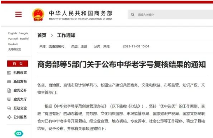11月初,商务部网站公布了《商务部等5部门关于公布中华老字号复核结果的通知》(以下简称《通知》),将长期经营不善的55个品牌,移出中华老字号名录;对经营不佳、业绩下滑的73个品牌,要求6个月予以整改;继续保留1000个经营规范、发展良好的品牌。