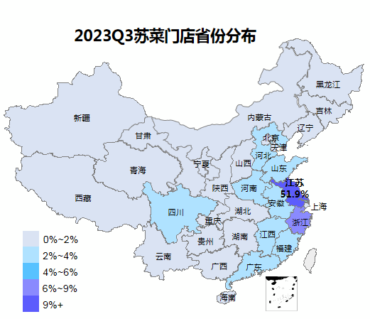 苏菜门店主要分布在东部沿海省市,长三角区域尤其多,区域性特征明显。