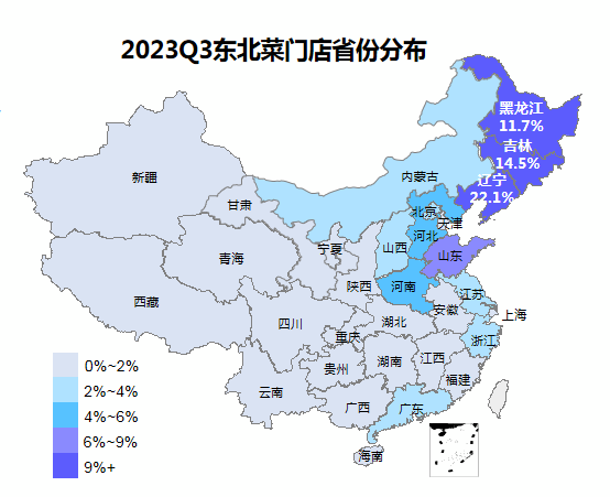 省份分布而言,东北菜门店主要分布在华北区域,近50%门店在东北三省,区域性分布特征仍非常明显。东北菜风味咸甜分明,以炖、煮、溜、拌为主,量大闻名于世。
