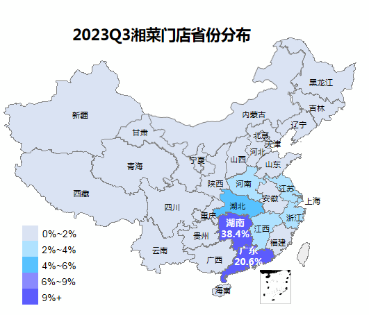 省份分布而言,湘菜门店以湖南为中心,向南部广东、东部到长三角地区渗透,目前门店主要分布在华中、华东、华南,区域性特征明显。