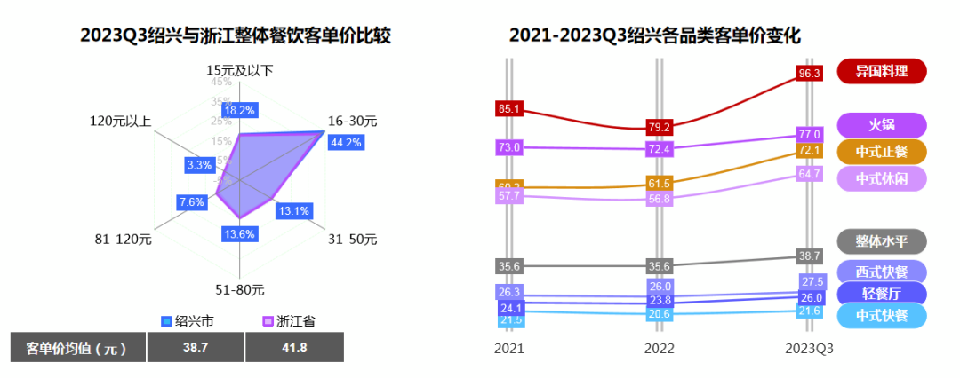 客单价变化来看,2023年绍兴各餐饮品类客单价都在上涨,随着经济逐渐复苏,消费能力逐渐释放,绍兴餐饮消费仍有较大上升空间。