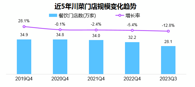 川菜是门店规模最大的地方菜系,2019年门店规模近35万家,之后逐年递减,截止2023Q3已减至28万家店。