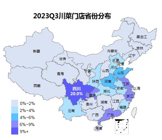 省份分布而言,川菜从川渝地区起源,向全国渗透中,主要是往东、往北扩散,相比其他菜系而言川菜的分布比较分散。