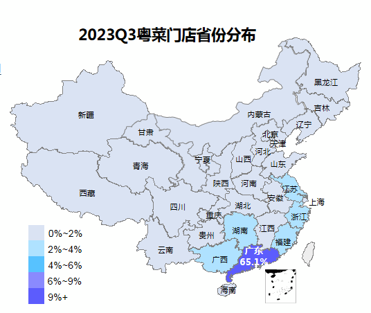 省份分布而言,粤菜门店超65%聚集在广东,区域特征目前仍非常明显,但也在向华东区渗透中。粤菜风味清淡本味,烧腊、煲仔饭、茶点非常有名
