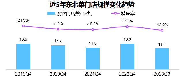 东北菜目前门店规模在地方菜系中排第四,疫情下门店规模急剧减少,2022年迅速复苏,2023年却又回落到11万家规模