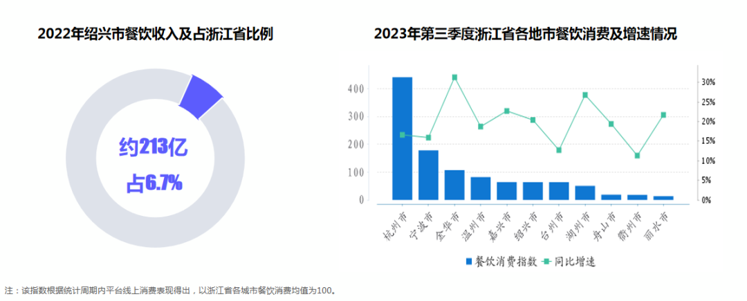 根据美团大数据显示,绍兴市餐饮消费在省内排名6,全国排名第46;增速方面,餐饮消费同比增长20.4%,较2021年复合同比增长17.1%