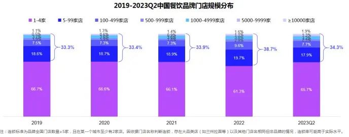 目前我国餐饮门店中约34.3%门店为连锁品牌门店,其中以门店规模≤100家店的小型品牌为主,不过近5年万店以上规模的连锁门店数占比逐年上升,伴随加盟和合伙模式的开放,会有更多品牌突破万店规模。